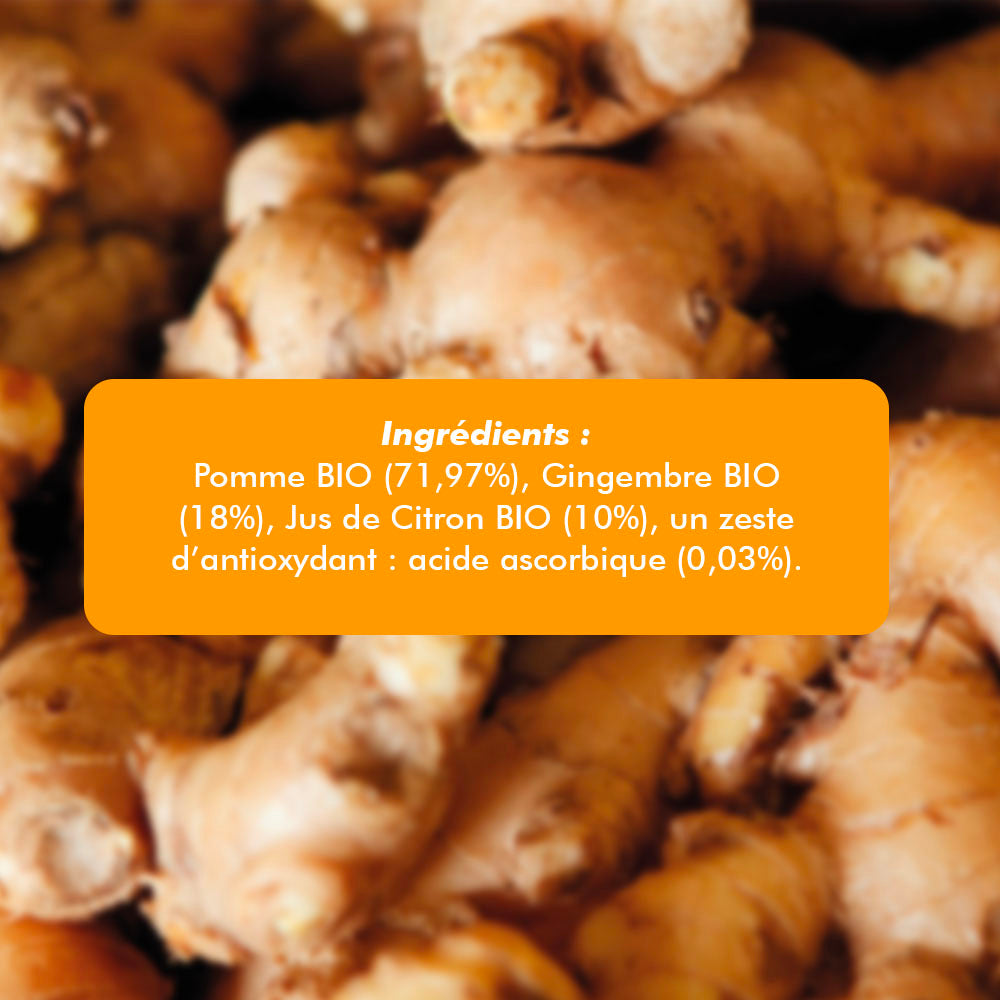 - Ingrédients naturels et bio : pomme, gingembre, citron.
