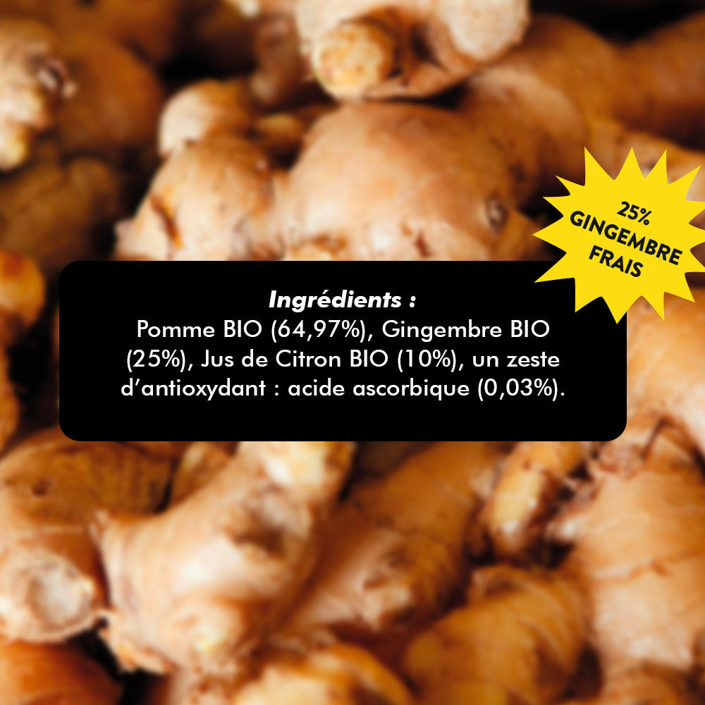 - Ingrédients naturels et bio : gingembre (25%), citron, pomme.