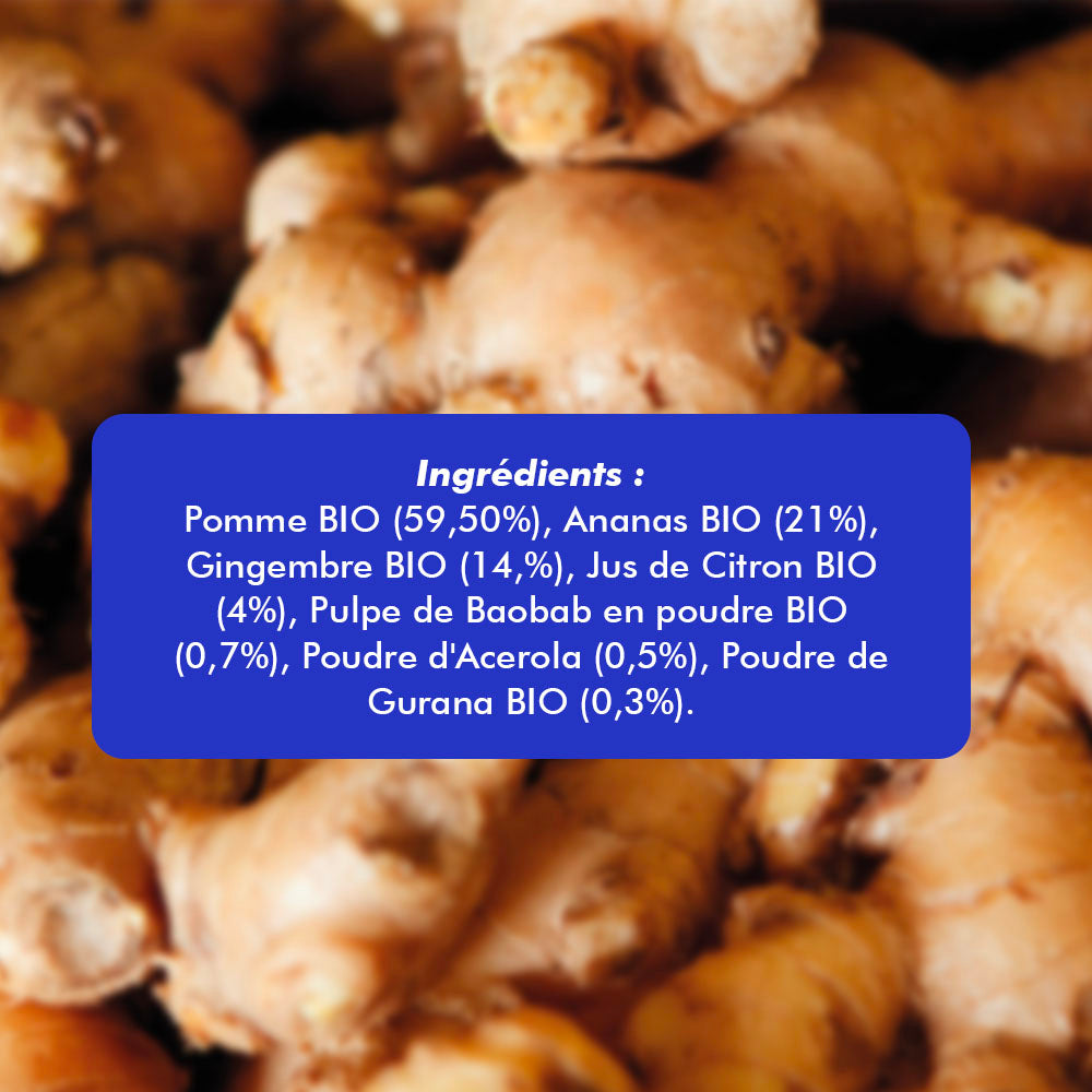 Composition de La Flamme : Pomme BIO (59,50%), Ananas BIO (21%), Gingembre BIO (14%), Jus de Citron BIO (4%), Pulpe de Baobab en poudre BIO (0,7%), Poudre d’Acerola (0,5%), Poudre de Gurana BIO (0,3%).