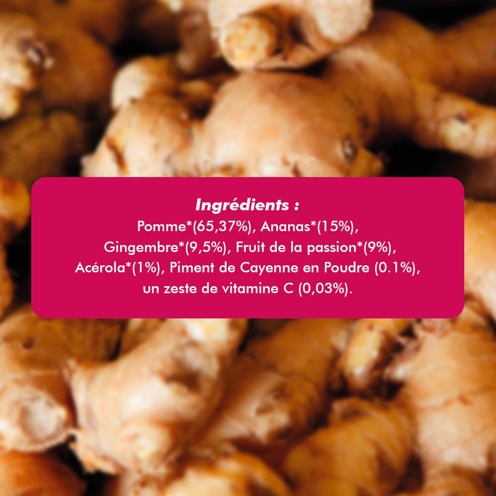 Chez Yumi, pas de place pour les trucs chimiques aux noms de robots : pas de E150d, ni de E440, encore moins de E330. On préfère des ingrédients simples, bio et bruts qui se suffisent à eux-mêmes. Parce qu’un shot doit être naturel, pas un cours de chimie !